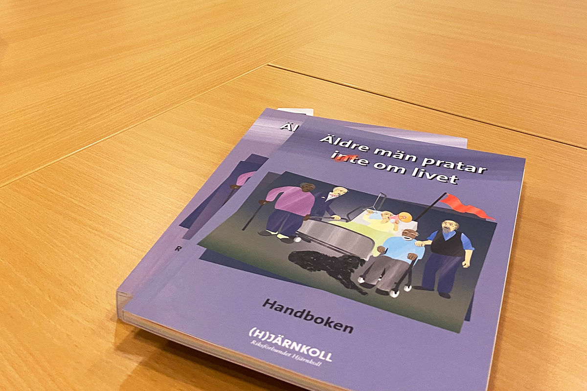 Men på senare år har det blivit lite bättre. Hon tror att det kan ha att göra med att man helt enkelt anstränger sig mer för att nå ut till männen. Bland annat deras informationsmöten, i anslutning till samtalsträffarna. Hon reser sig upp och hämtar en broschyr och en tjock bok. Boken innehåller forskning och resultat av träffarna, och broschyren delas ut vid mötena. På broschyrens framsida är det en tecknad bild på fyra leende och pratande äldre herrar.